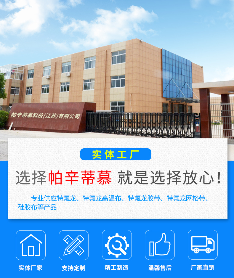 Copyright @ 2011-2018 帕辛蒂慕科技(江蘇)有限公司 All Rights Reserved. 版權所有 本站關鍵詞:特氟龍膠帶、特氟龍高溫布、鐵氟龍膜、特氟龍輸送帶、鐵氟龍膠帶 技術支持:泰州譽唯網絡 聯系電話:152 6104 6665 地址:江蘇省泰州泰興市根思鄉